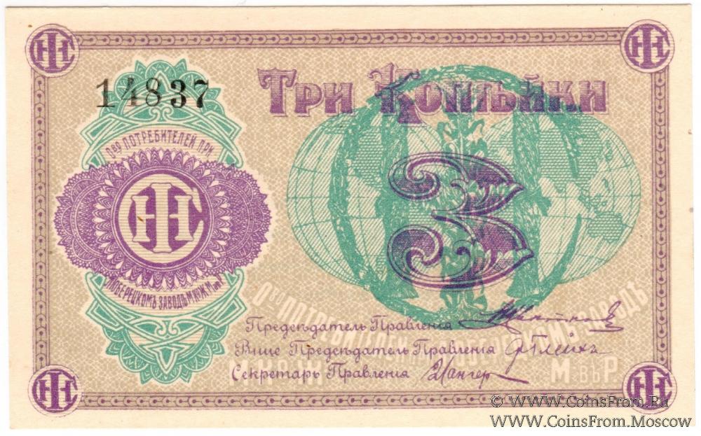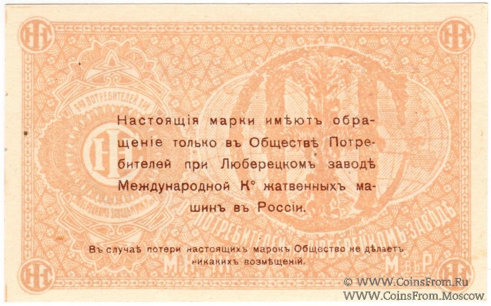 Марка без даты. Текст и виньетка фиолетовые. Общество потребителей при заводе Международной Ко жатвенных машин в России.
