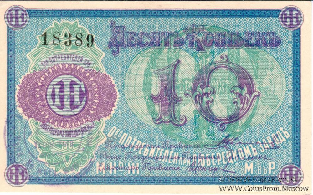 Марка без даты. Текст и виньетка фиолетовые. Общество потребителей при заводе Международной Ко жатвенных машин в России.