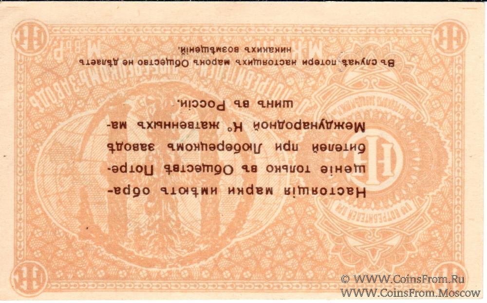 Марка без даты. Текст и виньетка фиолетовые. БРАК: реверс перевернут. Общество потребителей при заводе Международной Ко жатвенных машин в России.
