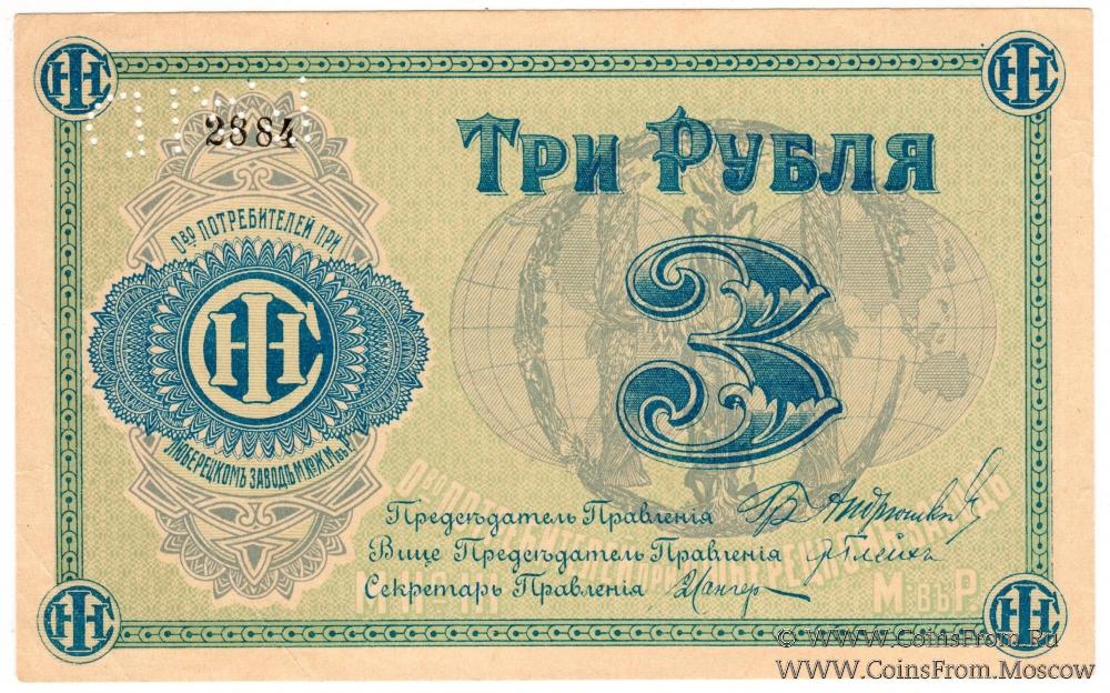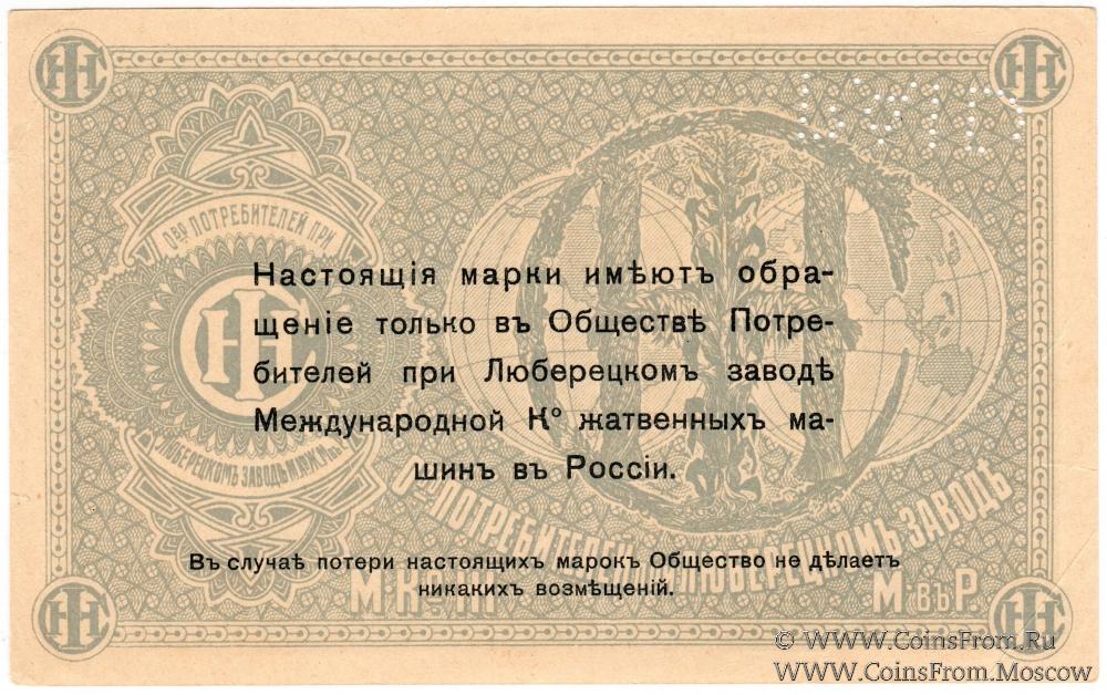 Марка без даты. Текст и виньетка синие. Гашение перфорацией "PAID". Общество потребителей при заводе Международной Ко жатвенных машин в России.