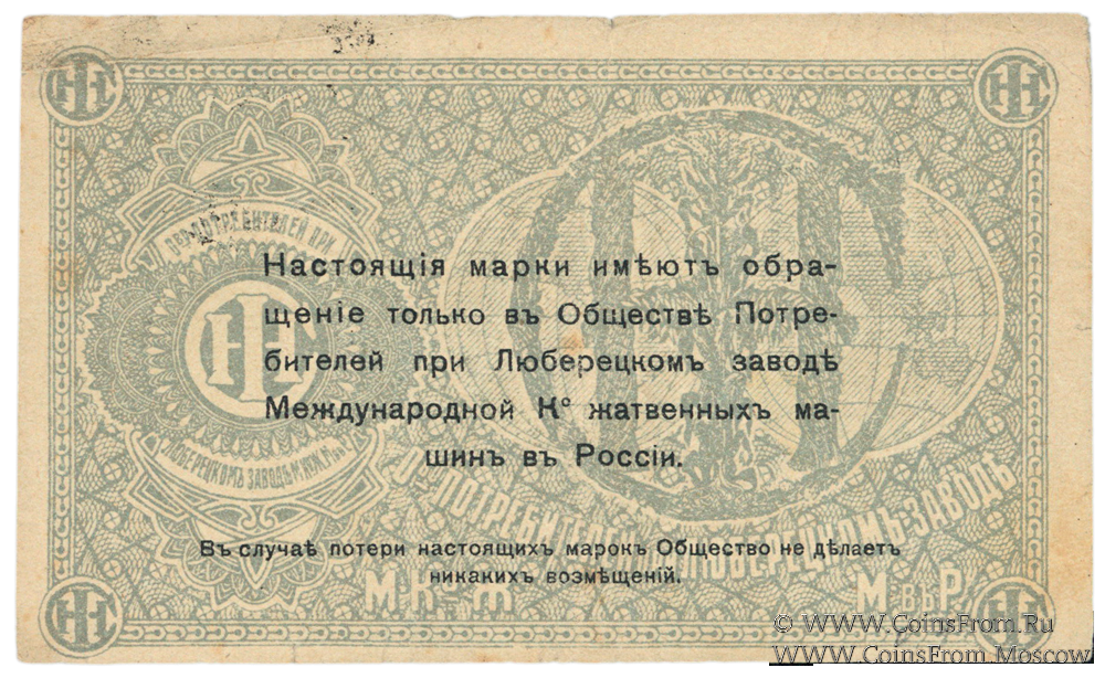 Марка без даты. Текст и виньетка черные. Общество потребителей при заводе Международной Ко жатвенных машин в России.