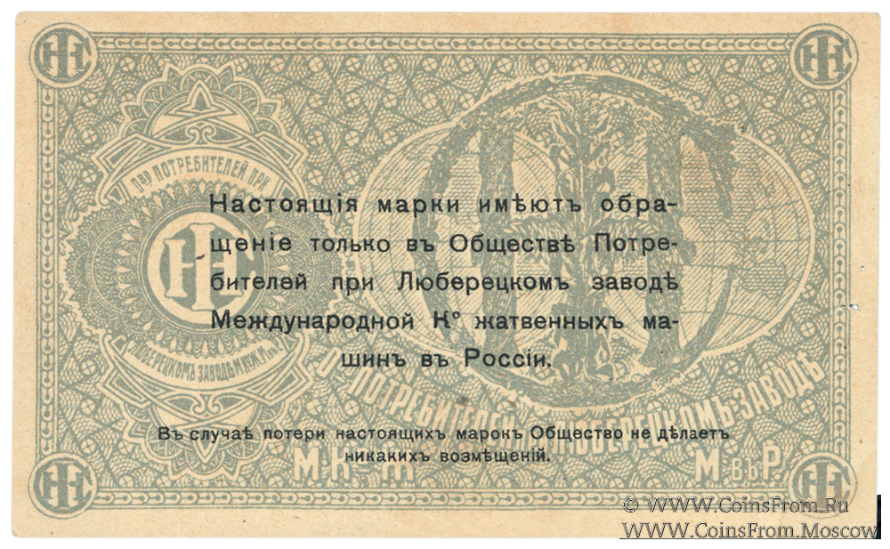 Марка без даты. Текст и виньетка черные. Общество потребителей при заводе Международной Ко жатвенных машин в России.