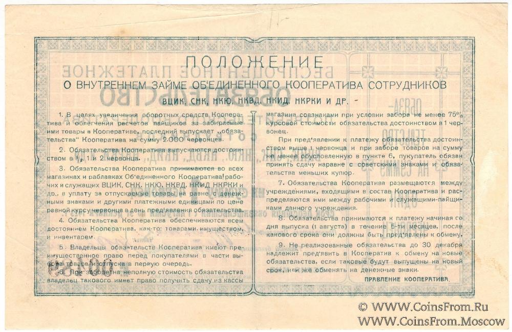 Беспроцентное платежное обязательство. Потребительский кооператив сотрудниковм ВЦИК, СНК, НКЮ, НКВД, НКИД, НКРКИ и др.