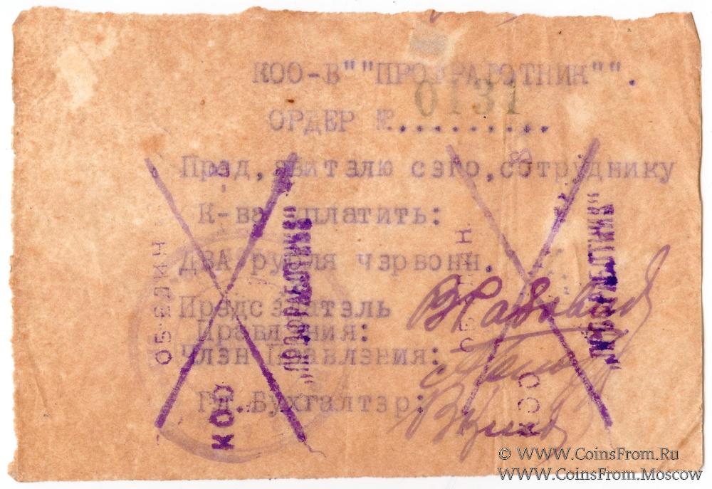 Ордер без даты (1923 г.) в червонном исчислении. Напечатан на пищущей машинке. Кооператив "Профработник".