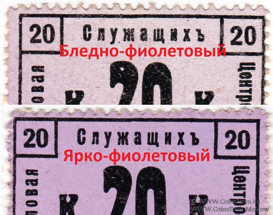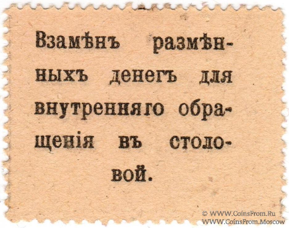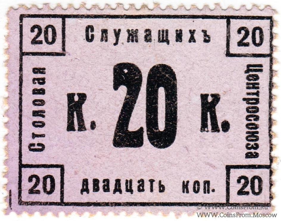 Расчетная марка без даты (1918 г.). Зубцы чёткие. Бледно-фиолетовый оттенок. Столовая Служащих Центросоюза.