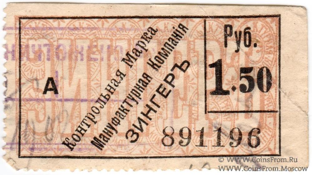 Контрольная марка без даты. Прямоугольный штамп "УНИЧТОЖЕНО". Мануфактурная Компания "ЗИНГЕРЪ".