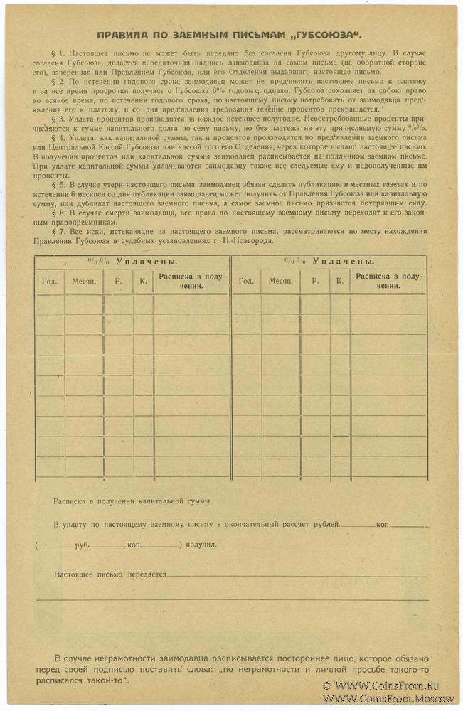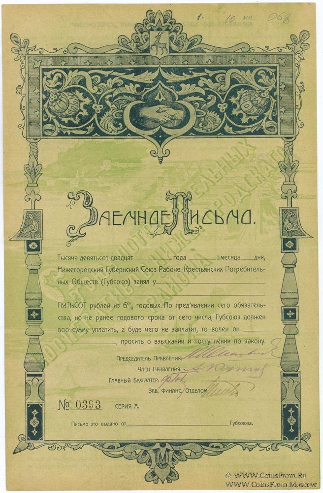 Заёмное письмо 1920 г. Серия А. Бланк с подписями. Нижегородский Губернский Союз Рабоче-Крестьянских Потребительных Обществ (ГУБСОЮЗ).