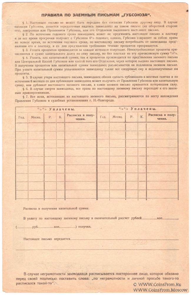 Заёмное письмо 1920 г. Серия Г. Бланк с подписями. Нижегородский Губернский Союз Рабоче-Крестьянских Потребительных Обществ (ГУБСОЮЗ).
