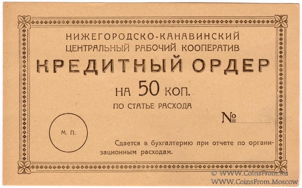Кредитный ордер без даты. Нижегородско-Канавинский Центральный Рабочий Кооператив.