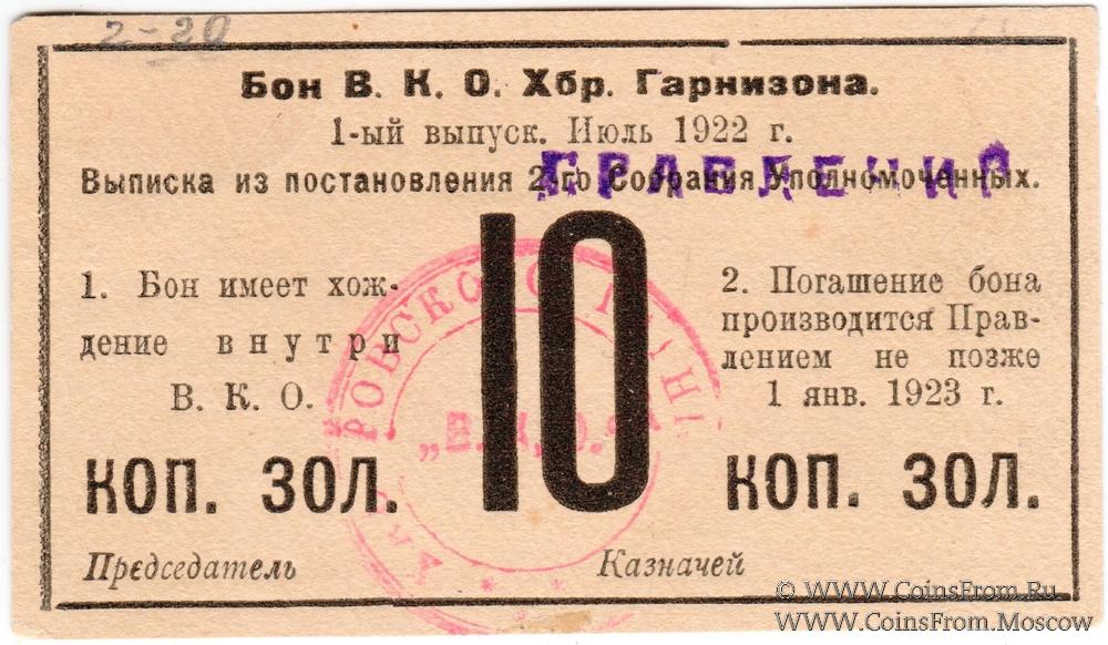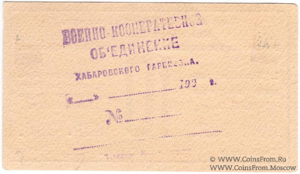 Бон (золотом). На аверсе штамп "ПРАВЛЕНИЯ" и круглая печать, на реверсе штамп ВКО. Военное Кооперативное Объединение Хабаровского Гарнизона (В.К.О. Хбр. Гарнизона).