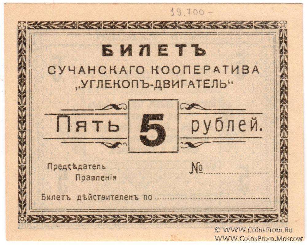 Билет без даты (1919 г.). Бланк. Сучанский Кооператив "Углекоп-Двигатель".
