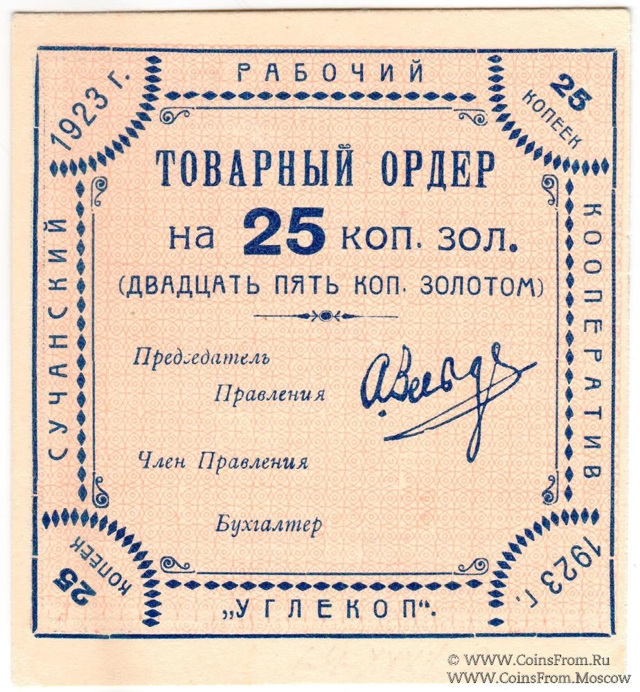 Товарный ордер (золотом) 1923 г. Серия З. Сучанский Рабочий Кооператив "Углекоп".