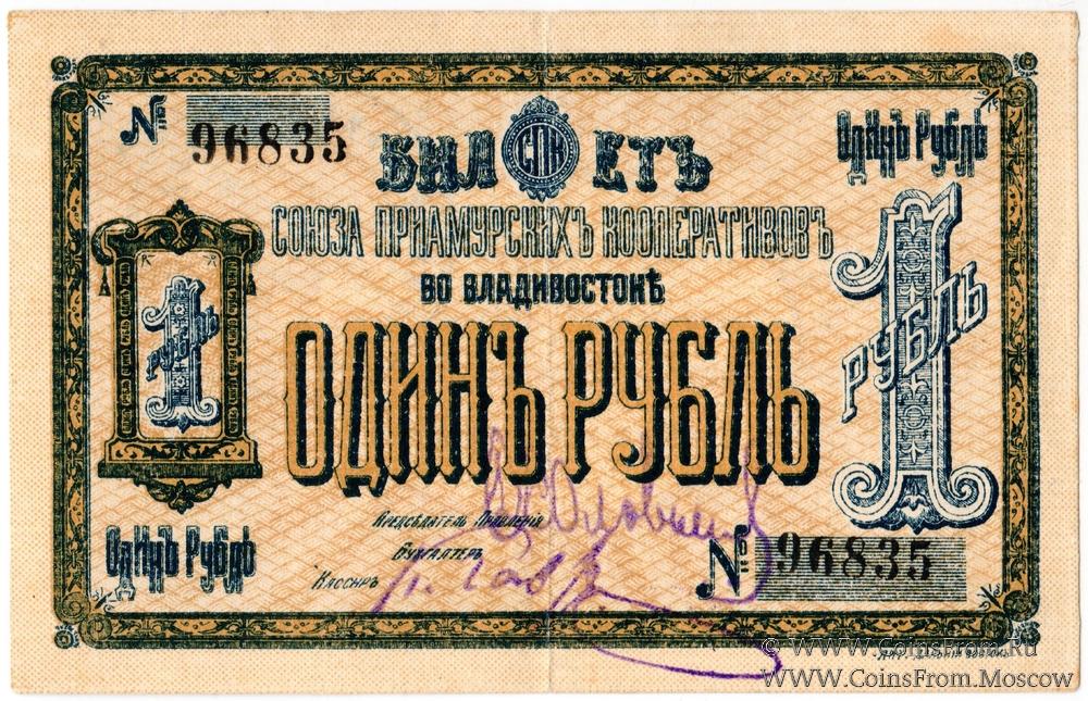 Печать круглая: "ВЛАДИВОСТОК" (по центру) / "СОЮЗ ПРИАМУРСКИХ КООПЕРАТИВОВ *" (по кругу)