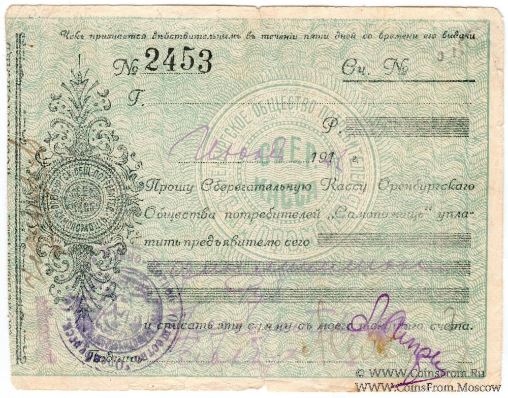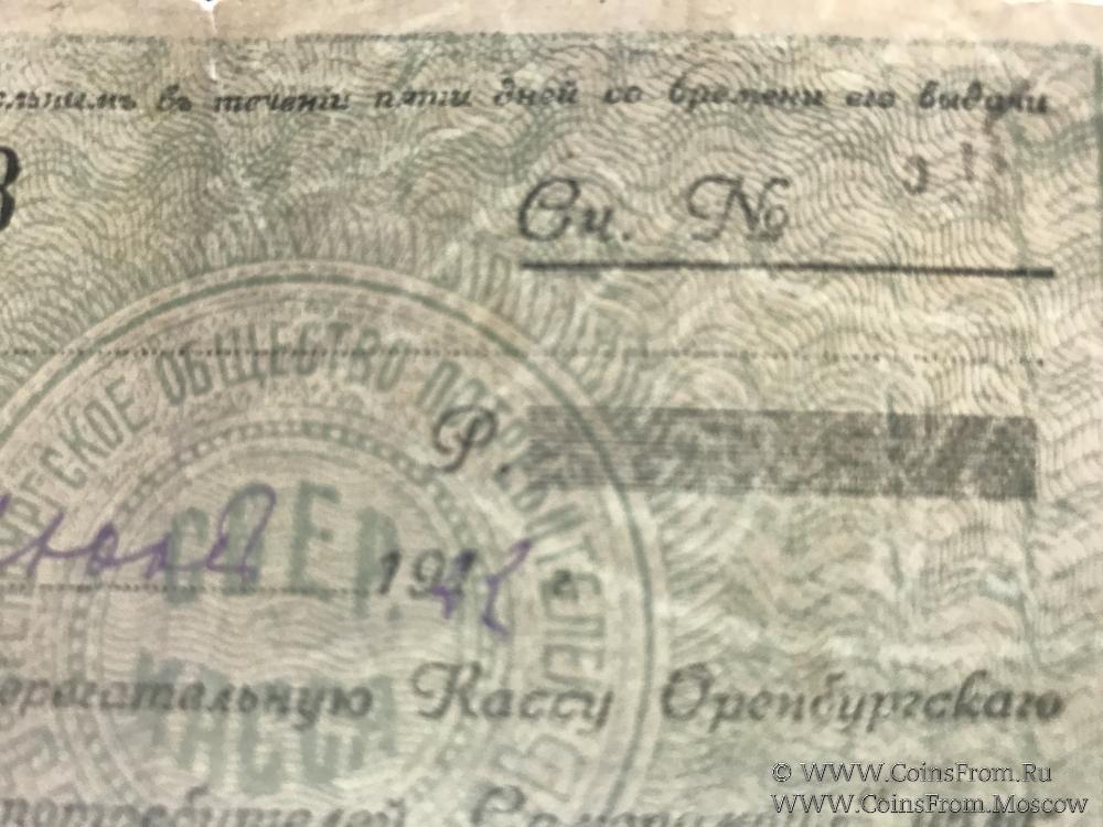 Чек 1922 г. Элементы водяного знака. Сберегательная касса Оренбургского общества потребителей "Самопомощь".