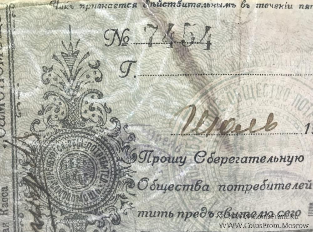 Чек 1922 г. Печать на реверсе. Элементы водяного знака. Сберегательная касса Оренбургского общества потребителей "Самопомощь".