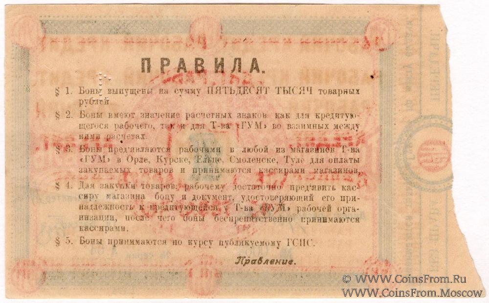 § 3. Боны предъявляются рабочими в любой из магазинов Товарищества "ГУМ" в Орле, Курске, Ельце, Смоленске, Туле для оплаты закупаемых товаров и принимаются кассирами магазинов.