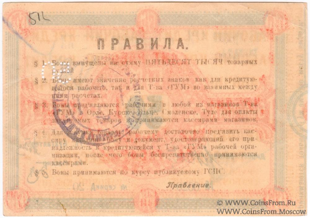 § 3. Боны предъявляются рабочими в любой из магазинов Товарищества "ГУМ" в Орле, Курске, Ельце, Смоленске, Туле для оплаты закупаемых товаров и принимаются кассирами магазинов.