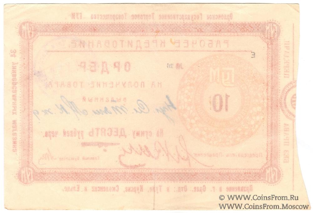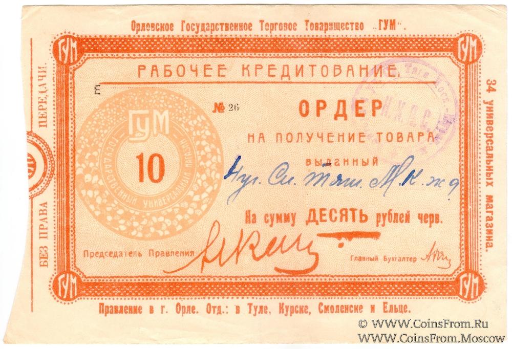 Ордер на получение товара (без права передачи) без даты (1923 г.). В червонных рублях. Печать 4.2. Текст и рамка оранжевого цвета. Бумага желтая. Орловское Государственное Торговое Товарищество "ГУМ".