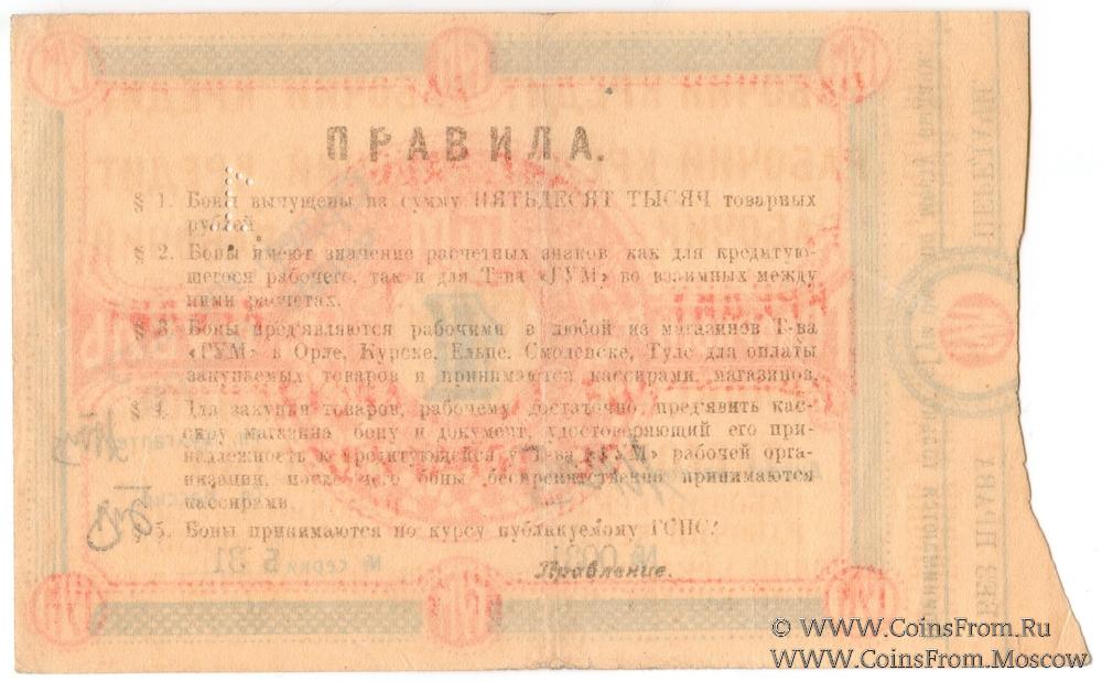 § 3. Боны предъявляются рабочими в любой из магазинов Товарищества "ГУМ" в Орле, Курске, Ельце, Смоленске, Туле для оплаты закупаемых товаров и принимаются кассирами магазинов.
