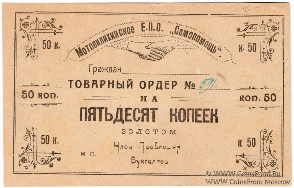 Товарный ордер золотом без даты (1923 г.). Мотовилихское Единое Общество Потребителей "САМОПОМОЩЬ".