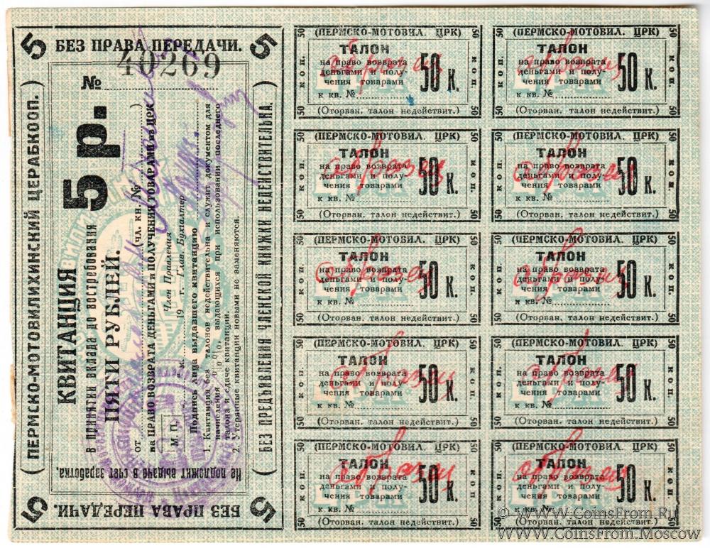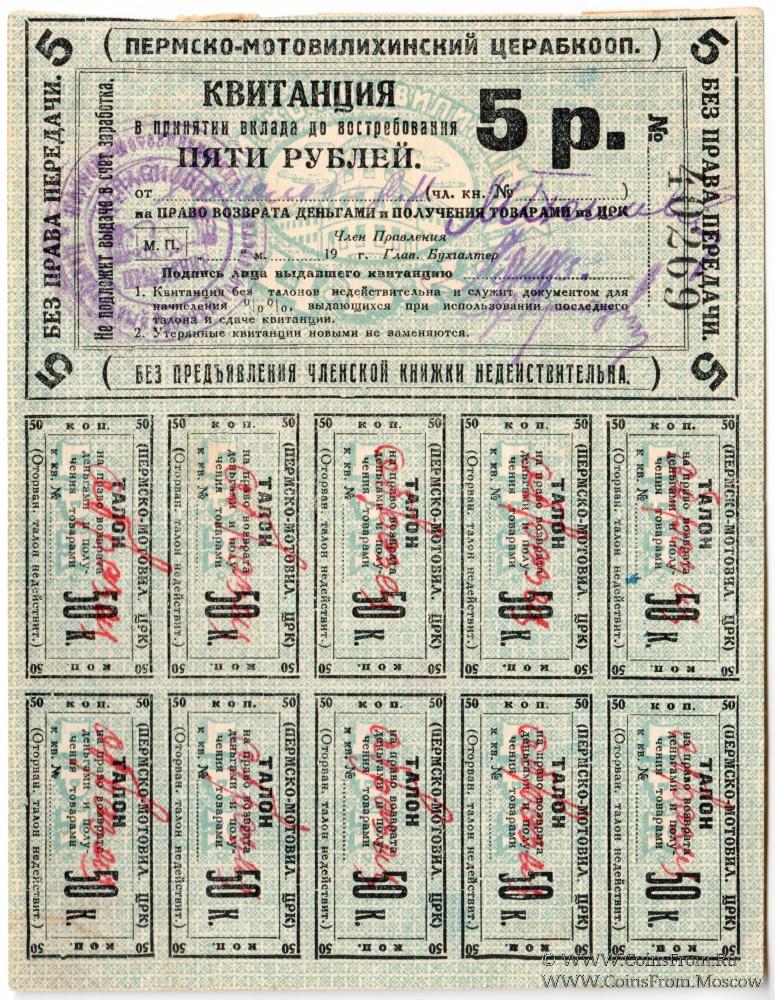 Квитанция 5 рублей без даты с 10 талонами по 50 копеек.