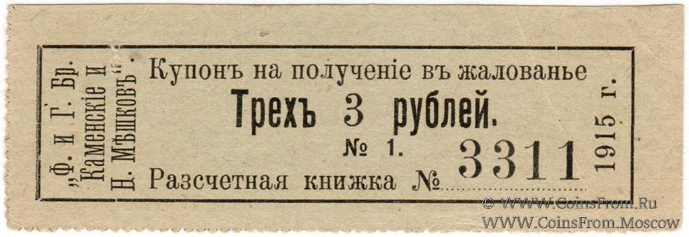 Купон на получение в жалованье. Зубцовка с 2-х сторон. Расчетная книжка № 3311. Ф. и Г. братья Каменские и Н. Мешков.