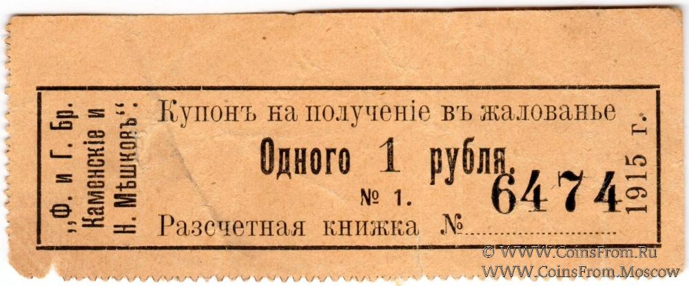 Купон на получение в жалованье. Зубцовка с 2-х сторон. Расчетная книжка № 6474. Ф. и Г. братья Каменские и Н. Мешков.