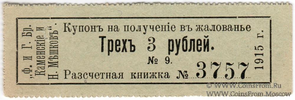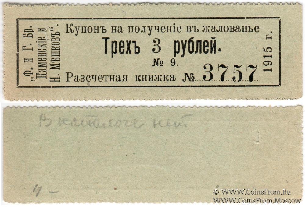 Купон на получение в жалованье. Зубцовка с 3-х сторон. Расчетная книжка № 3757. Ф. и Г. братья Каменские и Н. Мешков.