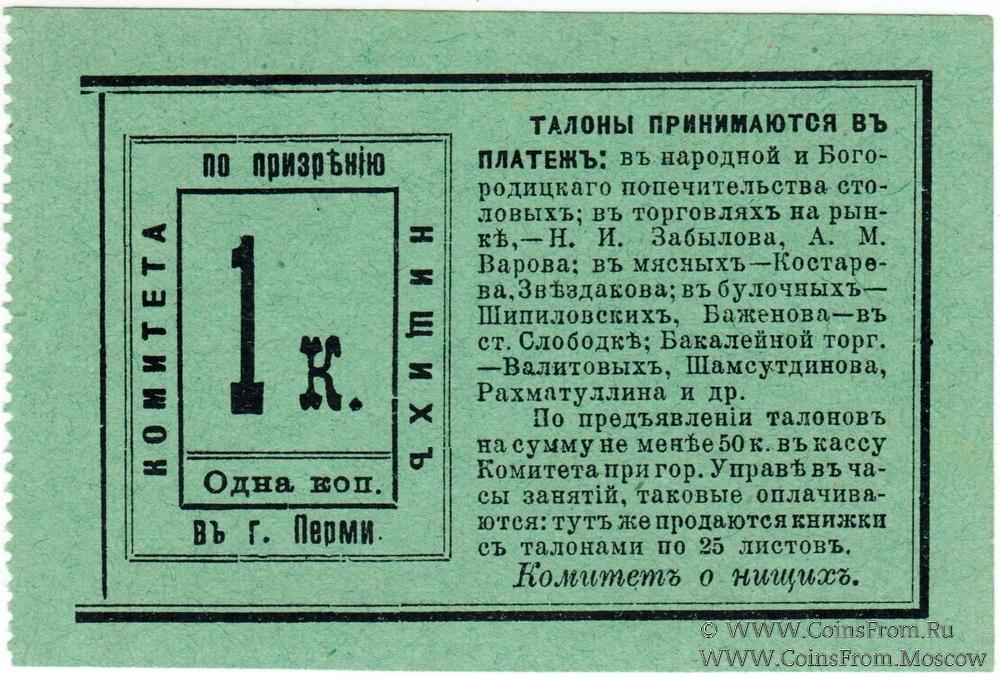 Талон без даты. Комитет по призрению нищих в г. Перми.