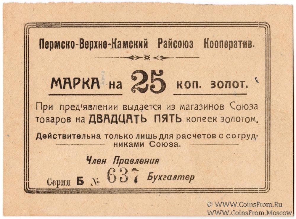 Марка без даты (1923 г.) в рублях золотом. Серия Б. Пермско-Верхне-Камский Райсоюз Кооперативов.
