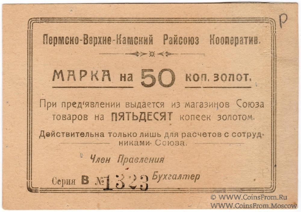 Марка без даты (1923 г.) в рублях золотом. Серия В. Пермско-Верхне-Камский Райсоюз Кооперативов.