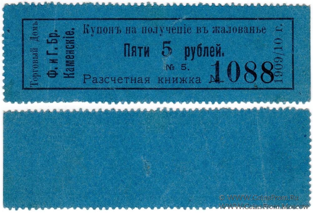 Купон на получение в жалованье. Расчетная книжка № 1088. Цифры номера больше. Торговый дом Ф. и Г. братья Каменские.