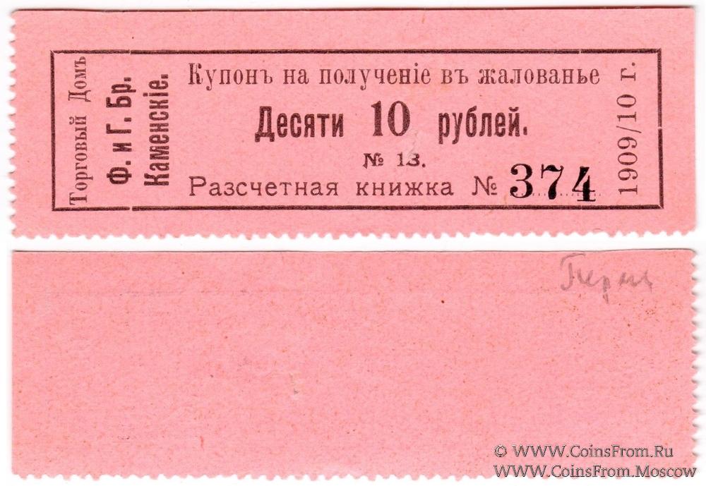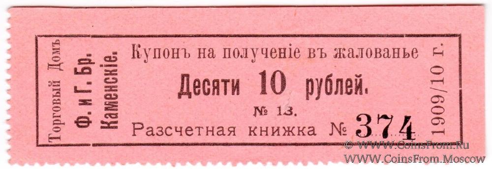 Купон на получение в жалованье. Расчетная книжка № 374. Торговый дом Ф. и Г. братья Каменские.