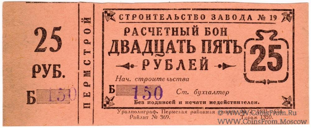 Расчетный бон. Серия Б (розовые). Бланк с купоном. Строительство завода №19. ПЕРМСТРОЙ.