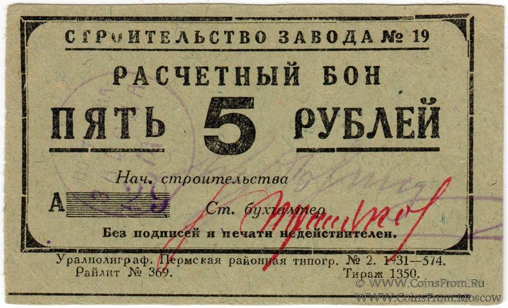 Расчетный бон. Серия А (зеленые). Строительство завода №19. ПЕРМСТРОЙ.