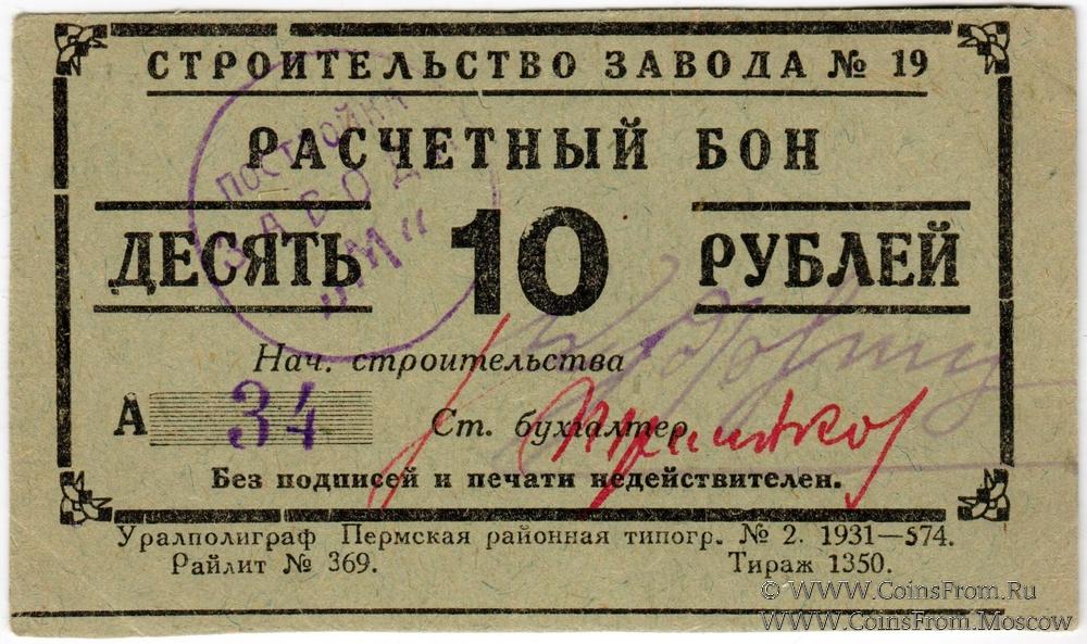 Расчетный бон. Серия А (зеленые). Строительство завода №19. ПЕРМСТРОЙ.