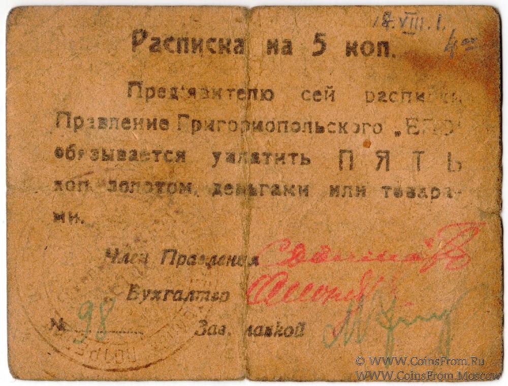 Печать круглая: "Г.ГРИГОРИОПОЛЯ "ЕПО"" (по центру в две строки) / "ЕДИНОЕ РАБОЧЕ-КРЕСТЬЯНСК. ПОТРЕБИТ. ОБЩЕСТВО *" (по кругу).