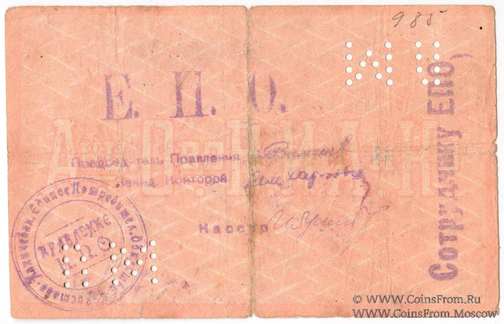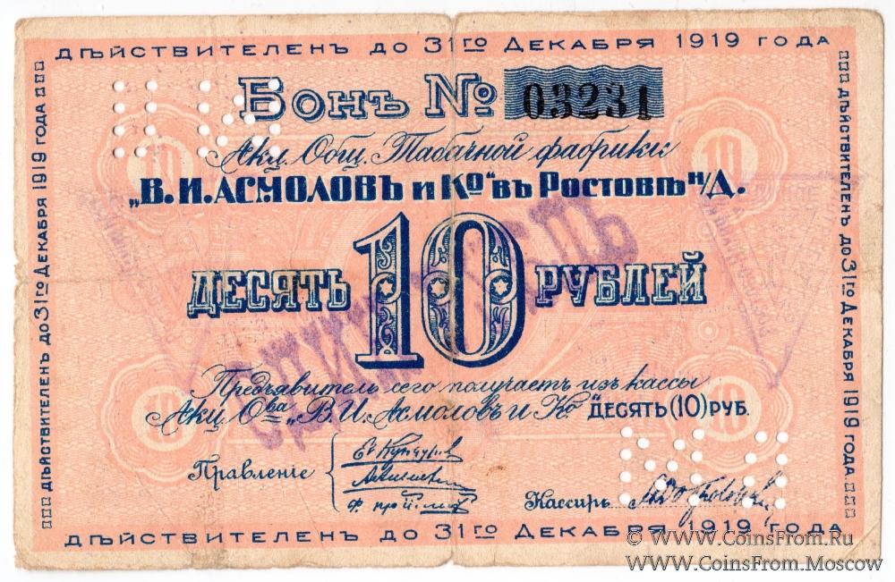 Аверс: Надпечатка "ОДИН РУБЛЬ" на 10 рублях 1919 г. Печати треугольной формы Ростово-Нахичеванского ЕПО. Перфорация "МЛ". Реверс: Печать Правления Ростово-Нахичеванского ЕПО, надпечатка "Сотруднику ЕПО".