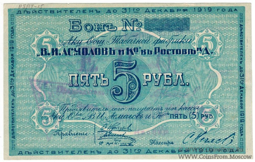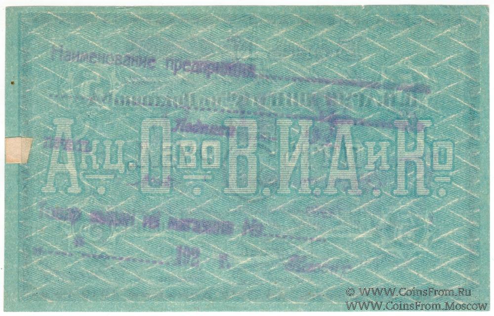 Бон. Бланк с проставленными штампами на аверсе и реверсе, не закончен. Акционерное Общество Табачной фабрики "В.И. Асмолов и Ко".