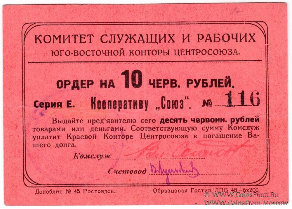 Ордер 1924 г. в червонных рублях. Номер 3-значный. Комитет служащих и рабочих Юго-восточной конторы Центросоюза.