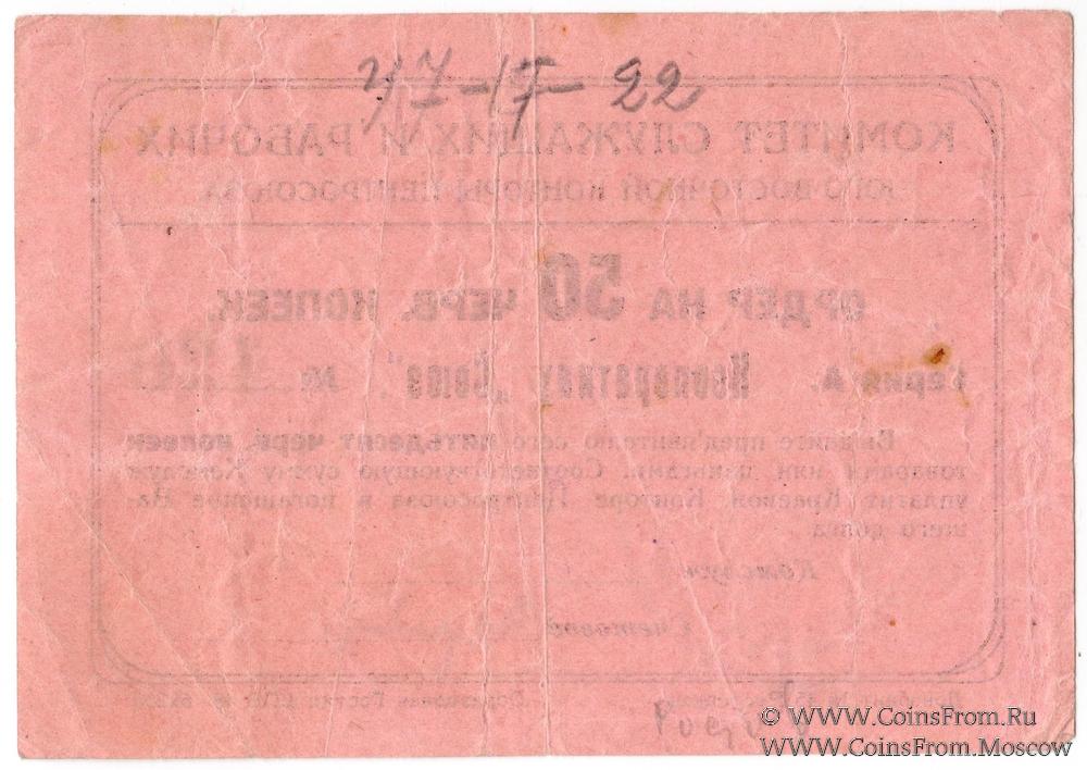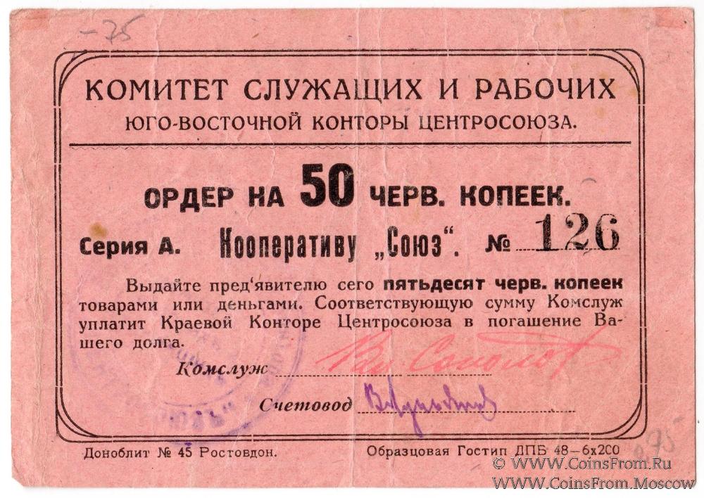 Ордер 1924 г. в червонных копейках. Номер 3-значный. Комитет служащих и рабочих Юго-восточной конторы Центросоюза.