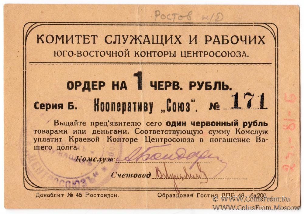 Ордер 1924 г. в червонных копейках. Номер 3-значный. Комитет служащих и рабочих Юго-восточной конторы Центросоюза.