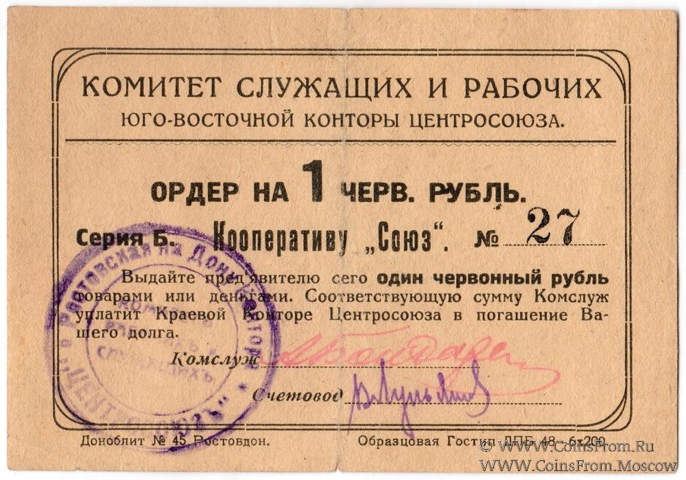 Ордер 1924 г. в червонных копейках. Номер 2-значный. Комитет служащих и рабочих Юго-восточной конторы Центросоюза.