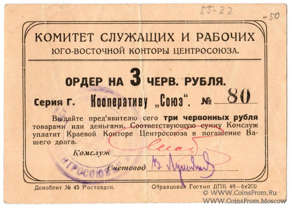 Ордер 1924 г. в червонных рублях. Номер 2-значный. Комитет служащих и рабочих Юго-восточной конторы Центросоюза.