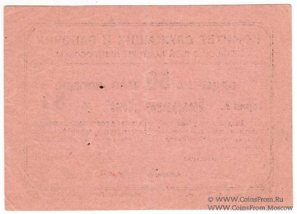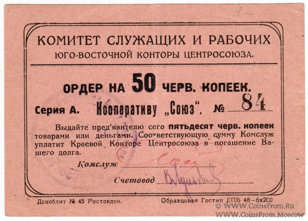 Ордер 1924 г. в червонных копейках. Номер 2-значный. Комитет служащих и рабочих Юго-восточной конторы Центросоюза.