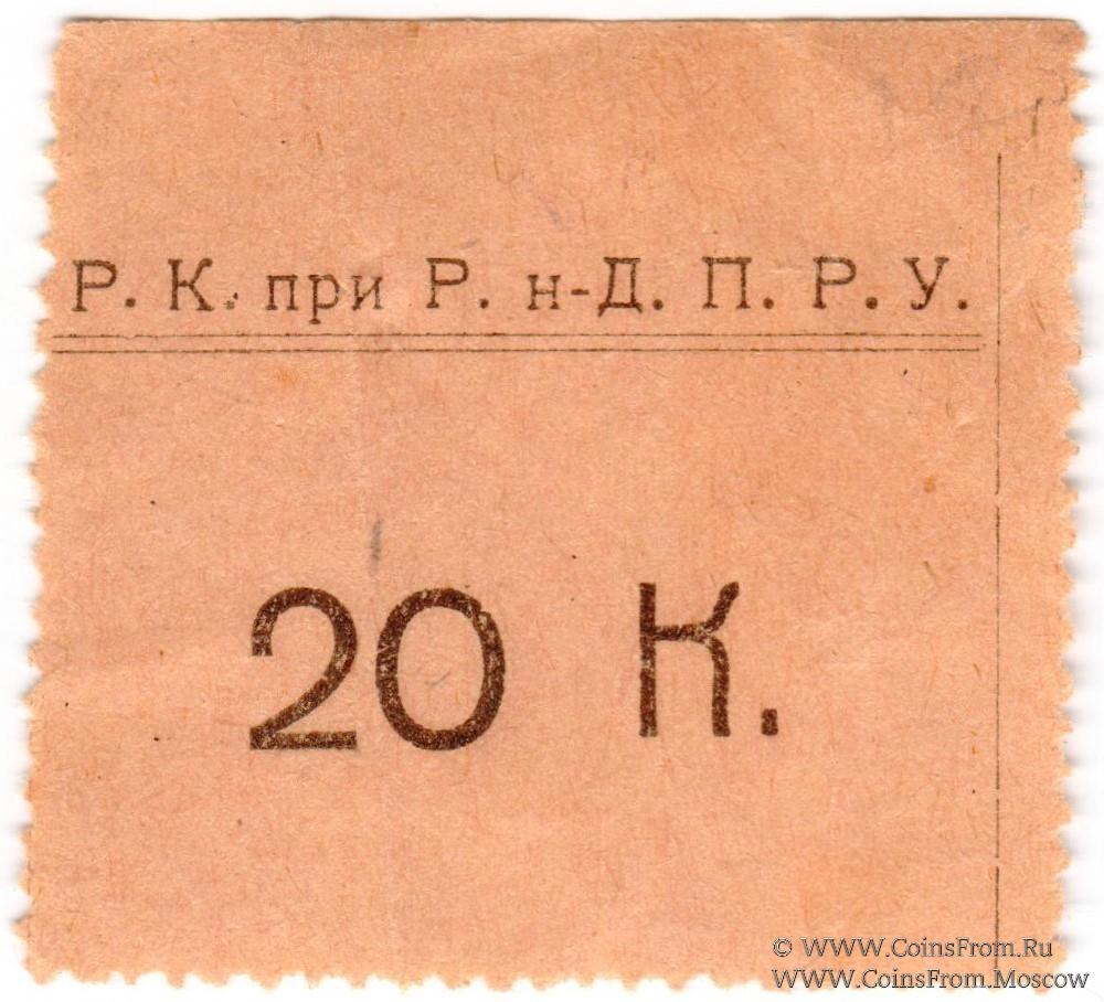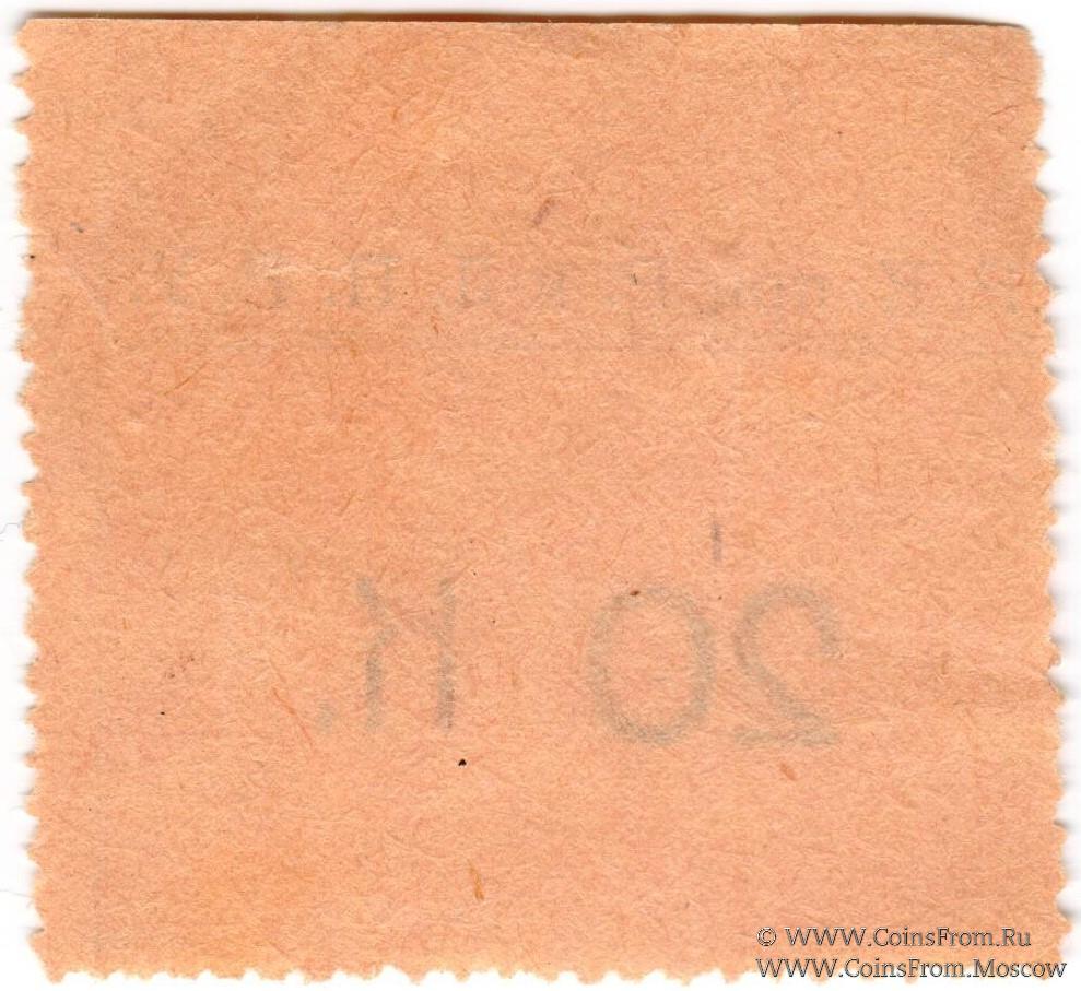 Буква "к" большая. Цифры номинала "20" узкие и низкие. Перфорация с 3-х сторон. Р.К. при Р.н-Д. П.Р.У. (Родительский Комитет при Ростовском-на-Дону Петровском реальном училище).