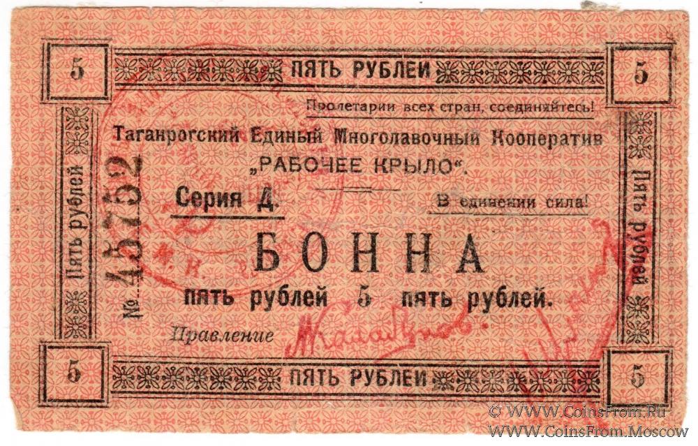 Бона без даты (1919 г.). Серия Д. С оттиском печати и факсимиле подписей ответственных лиц. Единый Многолавочный Кооператив "Рабочее крыло".