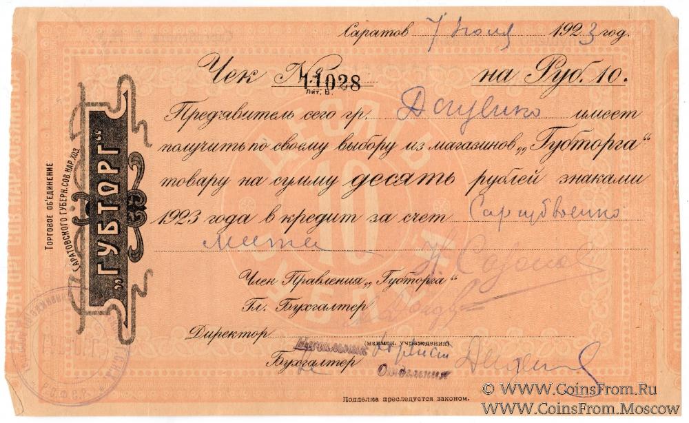 Чек. Двухсторонний оформленный, с оттиском печати ГУБТОРГА, штампом на реверсе и подписями ответственных лиц.
