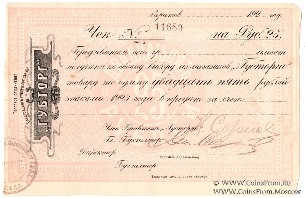 Круглая печать: "ГУБТОРГ." (по центру) / "Торговое Об`единение Саратовского Г.С.Н.Х. *Р.С.Ф.С.Р.* " (по кругу).