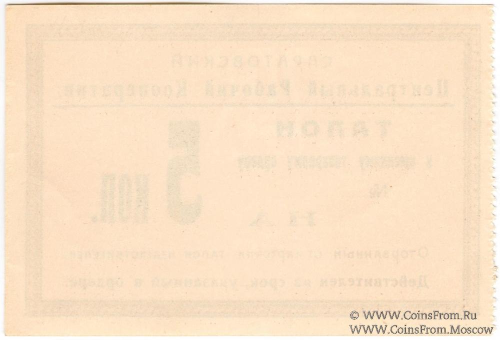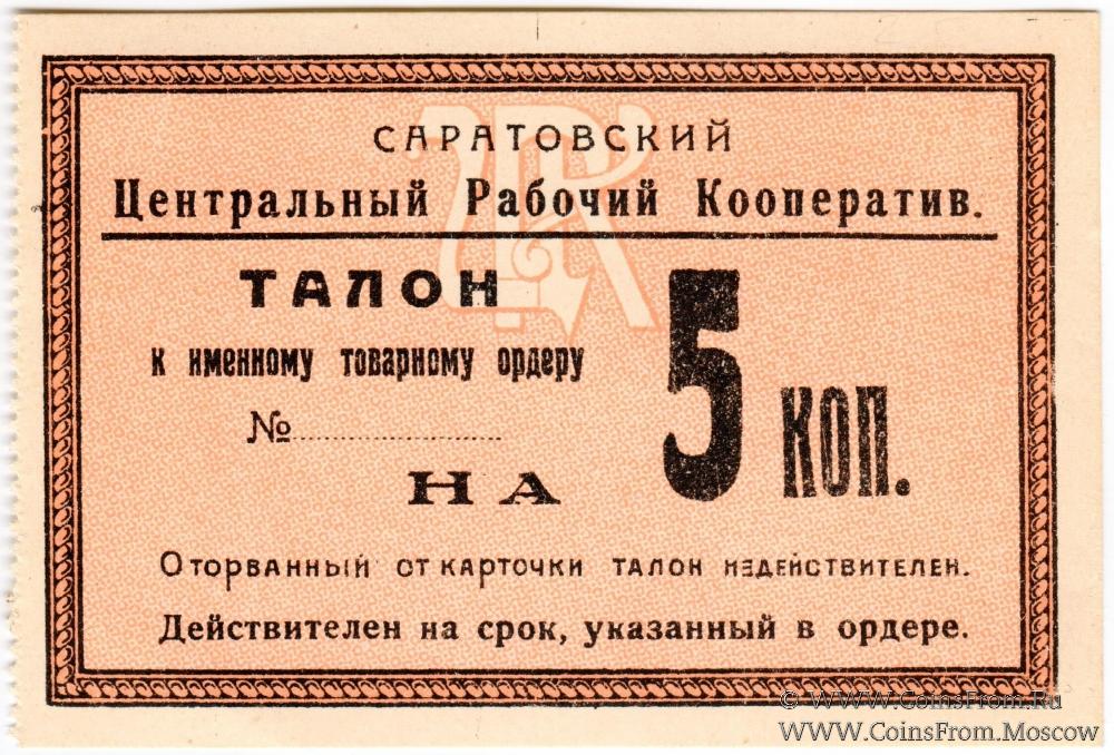 Талон к именному товарному ордеру без даты (1919 г.). Саратовский Центральный Рабочий Кооператив.